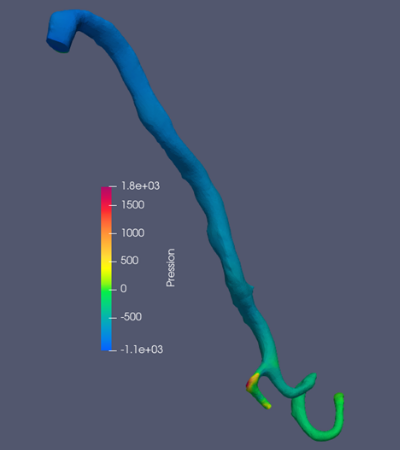 Un solveur CFD personnalisé non-newtonien a été développé pour simuler l’écoulement sanguin dans des géométries coronaires, extraites de scanners CCTA. Les simulations CFD ont permis de calculer les champs de pression et de vitesse pour chaque géométrie. Ces données ont ensuite été utilisées pour entraîner un modèle d’apprentissage profond capable CNN/GAN, à partir du seul maillage de l’artère coronaire, de prédire les champs de pression et de vitesse associés. L’entraînement et la validation ont été réalisés sur des cas synthétiques et réels, via validation croisée.